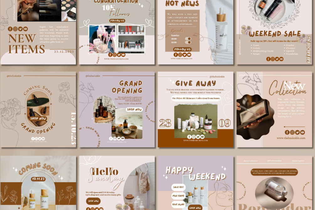 Cosmetic Instagram Templates is an excellent helper in this regard! This template will assist you in matching and synchronizing your brand's style, such as fonts, photos, logos, and colors, so that your brand can be recognized everywhere it appears.
