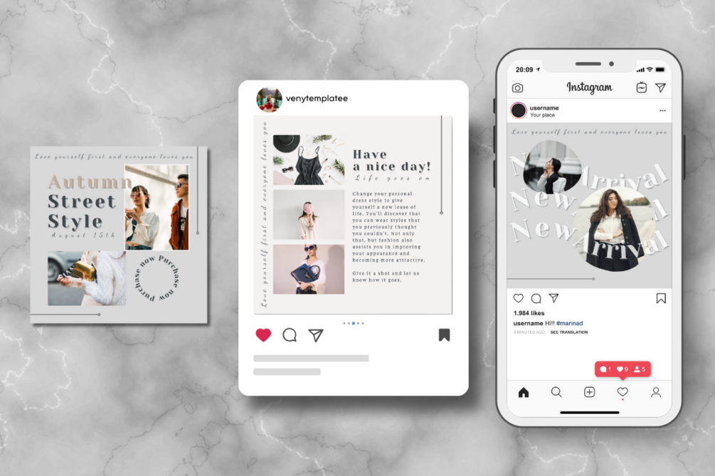 Fashion Instagram Templates is an excellent helper in this regard! This template will assist you in matching and synchronizing your brand's style, such as fonts, photos, logos, and colors, so that your brand can be recognized everywhere it appears.